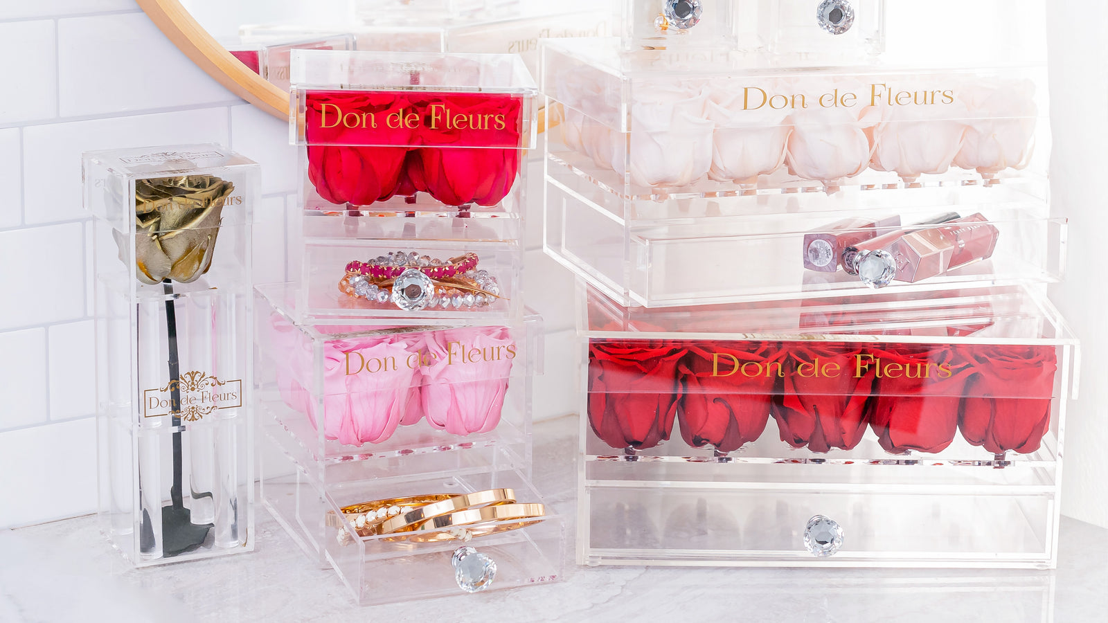 Admire the beauty of this luxurious collection from all angles. These beautiful arrangements of preserved roses are encased in a clear, acrylic case that offers a 360-degree view of opulence and elegance.
