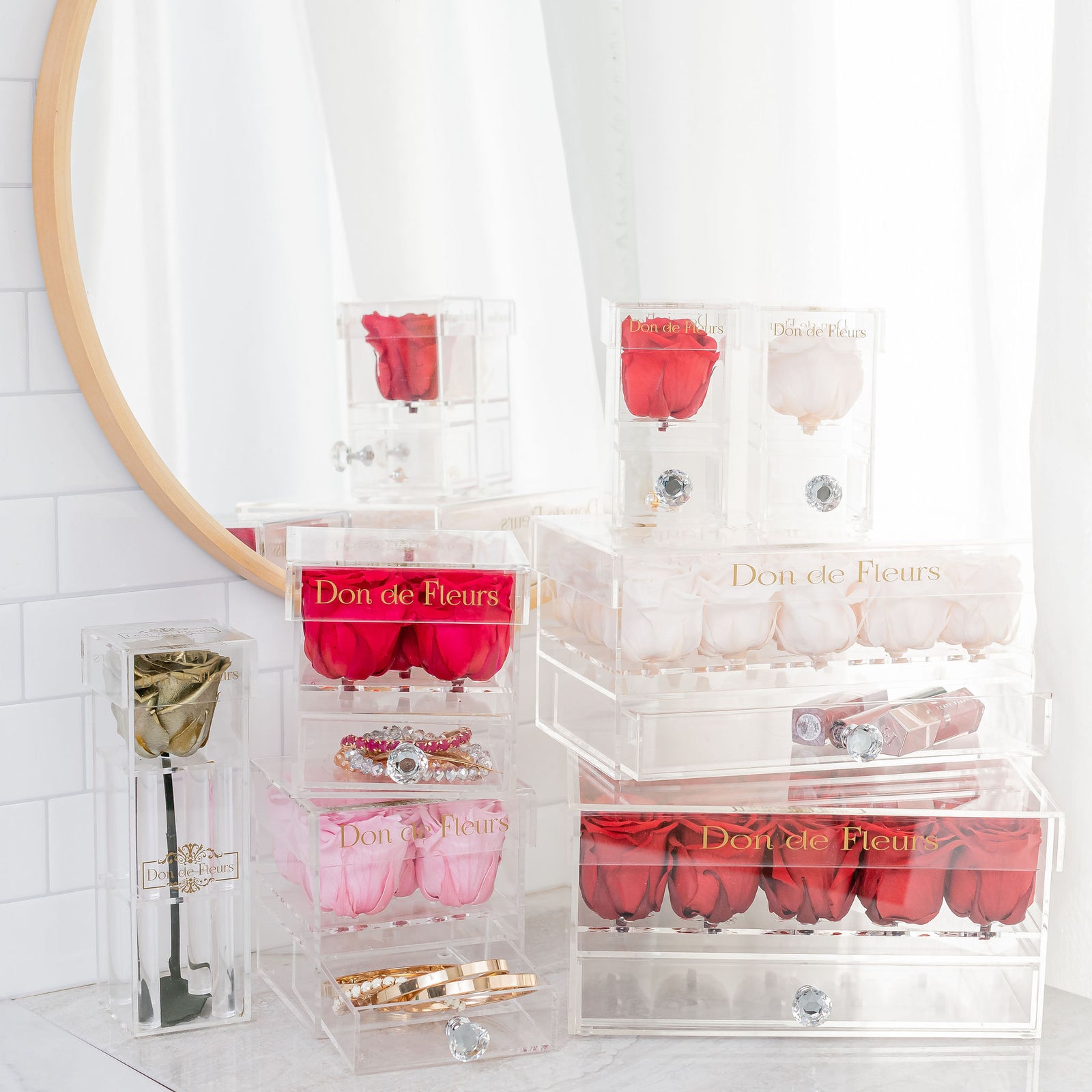 The Acrylic 25 is the ultimate gift of luxury, featuring a bed of 25 preserved roses that last for up to a year.